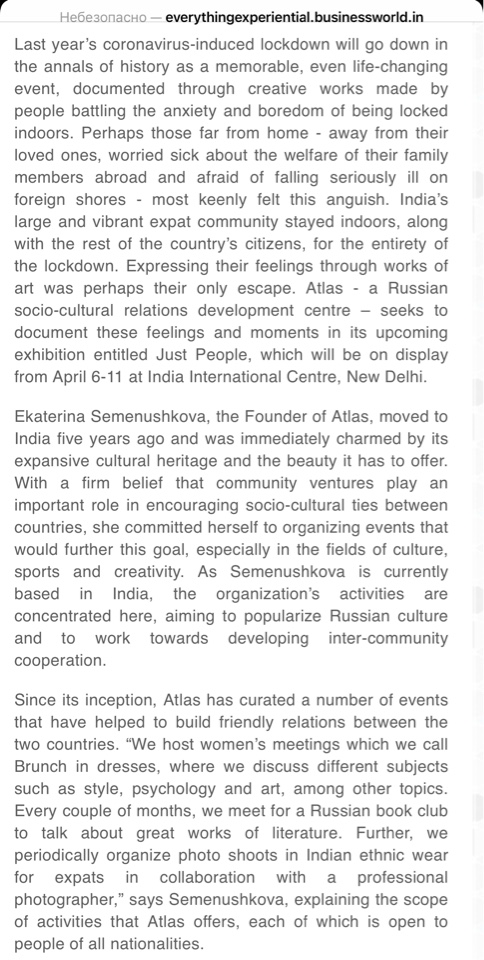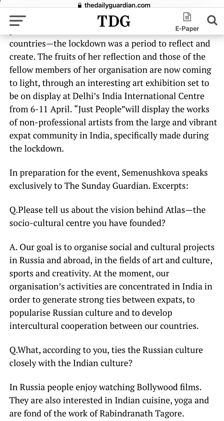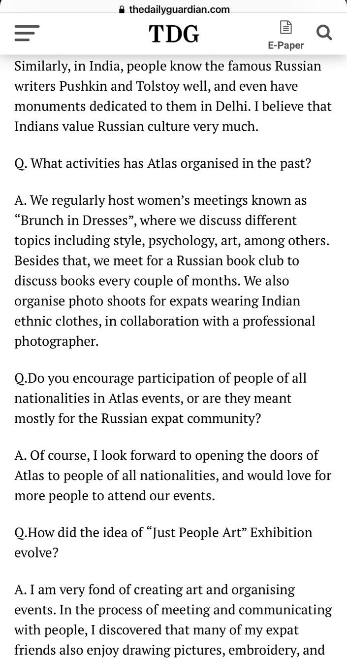 НАША ОРГАНИЗАЦИЯ «АТЛАС» ТАКЖЕ ПОДДЕЛАЛАСЬ СВОИМИ ПРОЕКТАМИ - АРТ-ПРОСТРАНСТВО СООБЩЕСТВА СООТЕЧЕСТВЕННИКОВ РОССИИ, РУССКИЙ КНИЖНЫЙ КЛУБ «БРАНЧ С КНИГОЙ», ВЫСТАВКА ИСКУССТВ «ПРОСТО ЛЮДИ», КУРАТОРСТВО ВОД «ВОЛОНТЕРЫ ПОБЕДЫ» В ИНДИИ. БЛАГОДАРИМ ПОСОЛЬСТВО РОССИИ В ИНДИИ ЗА ПРИГЛАШЕНИЕ И ВОЗМОЖНОСТЬ УЧАСТИЯ В КОНФЕРЕНЦИИ.